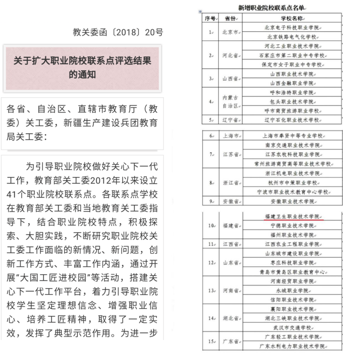 據(jù)悉,教育部關(guān)工委2012年以來在全國職業(yè)院校中設(shè)立41個職業(yè)院校聯(lián)系點。今年6月,教育部關(guān)工委啟動新增職業(yè)院校聯(lián)系點工作。學(xué)院關(guān)工委經(jīng)多年努力,積極開展自評申報,我院關(guān)工委以黨委領(lǐng)導(dǎo)重視、機構(gòu)制度完善、保障措施有力、品牌特色突出,展現(xiàn)了職業(yè)院校關(guān)工委建設(shè)的新成果,經(jīng)福建省教育系統(tǒng)關(guān)工委遴選推薦,教育部關(guān)工委常務(wù)主任辦公會研究確定,被教育部關(guān)工委確定為新增職業(yè)院校聯(lián)系點。