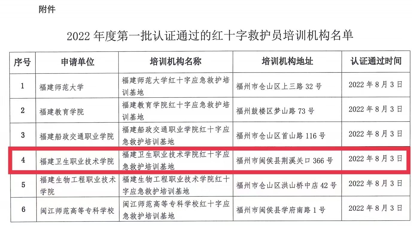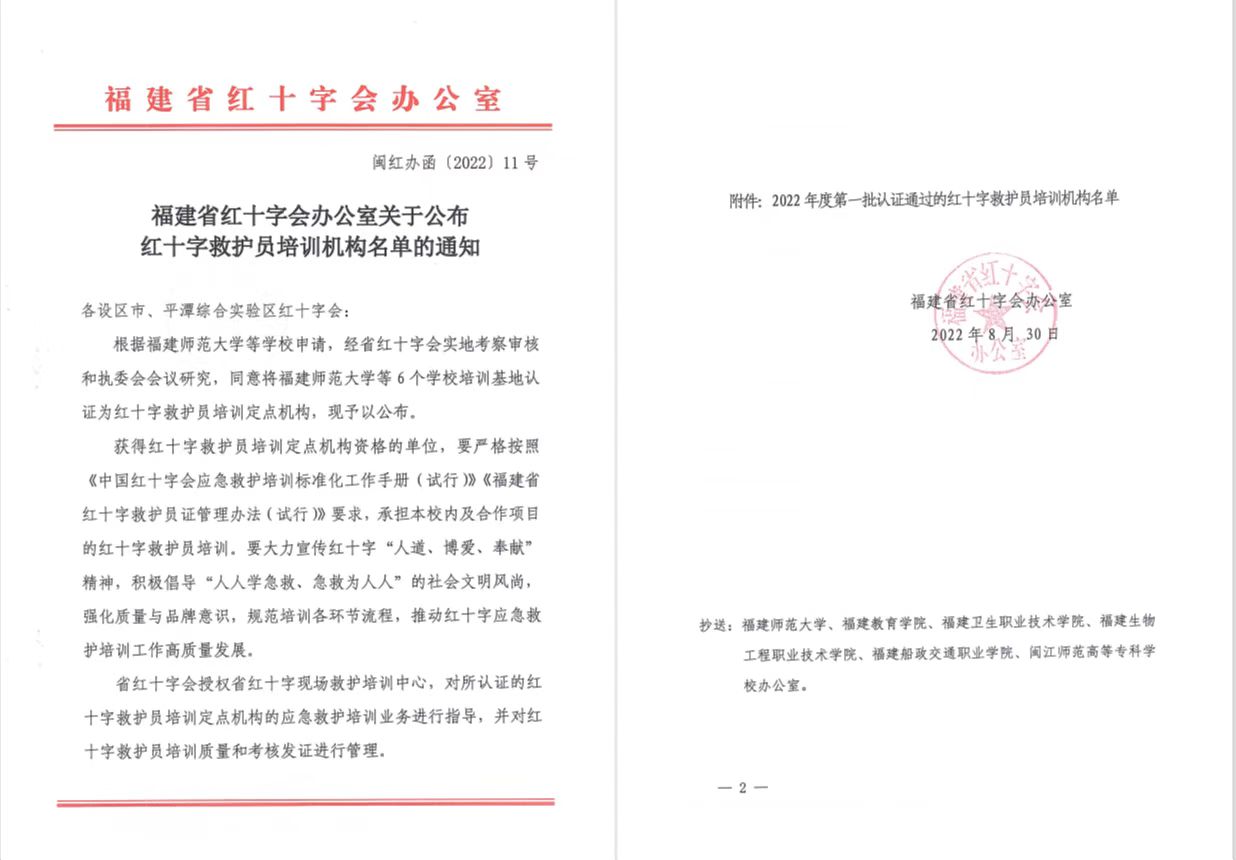 近日,福建省紅十字會辦公室公布了《紅十字救護員培訓機構名單的通知》,經(jīng)福建省紅十字會實地考察審核,我校被認證為紅十字救護員培訓定點機構。