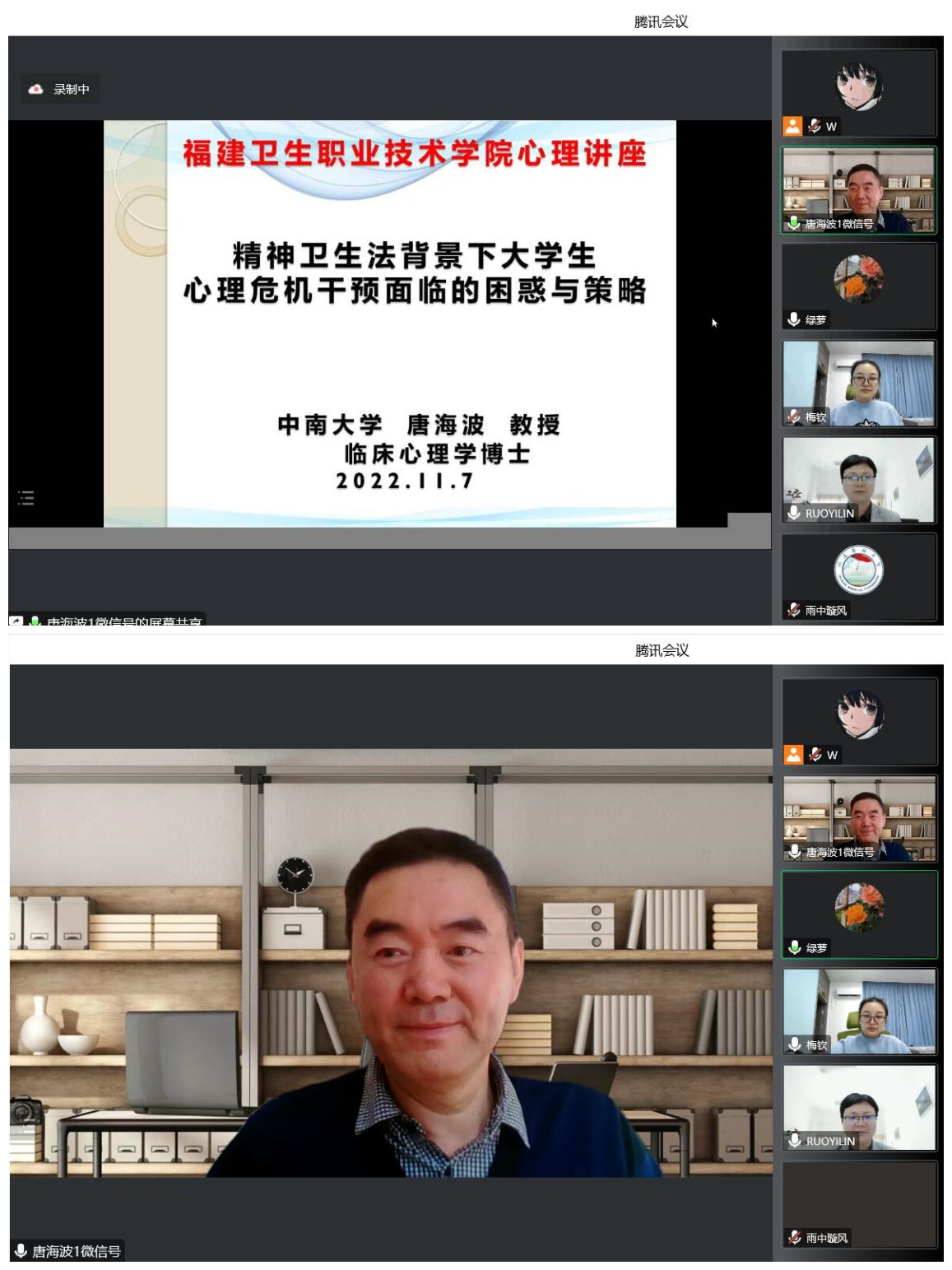 大學(xué)生心理健康教育是高校學(xué)生管理中的一項非常重要的問題,其中一個關(guān)鍵難點(diǎn)就是心理危機(jī)的預(yù)防與干預(yù)。為加強(qiáng)學(xué)校心理危機(jī)工作建設(shè),提升心理危機(jī)意識,熟悉干預(yù)工作流程,進(jìn)一步提高學(xué)生工作隊伍的心理危機(jī)事件干預(yù)處置能力。11月7日下午,我校特邀中南大學(xué)心理健康教育與咨詢專家、湖南省心理衛(wèi)生協(xié)會大學(xué)生心理咨詢專業(yè)委員會主任唐海波教授開展《精神衛(wèi)生法背景下大學(xué)生心理危機(jī)干預(yù)策略》線上專題講座。副校長黃銘珊,學(xué)生工作部部長、各院系黨總支書記或副書記、二級心理輔導(dǎo)站站長、全體專兼職輔導(dǎo)員、心理健康教育中心和教研室老師等參加本次講座。