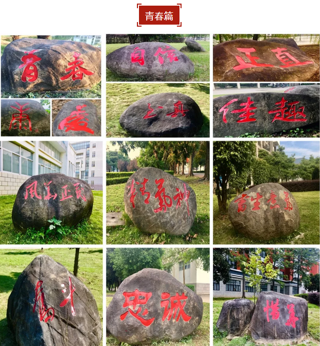 傳統(tǒng)與現(xiàn)代并存,書法與石刻融合,賦予天然卵石文化內(nèi)涵和藝術(shù)生命,提升景觀建設(shè)文化藝術(shù)品位,營造環(huán)境育人良好氛圍,也是對中華優(yōu)秀文化的傳承與弘揚。