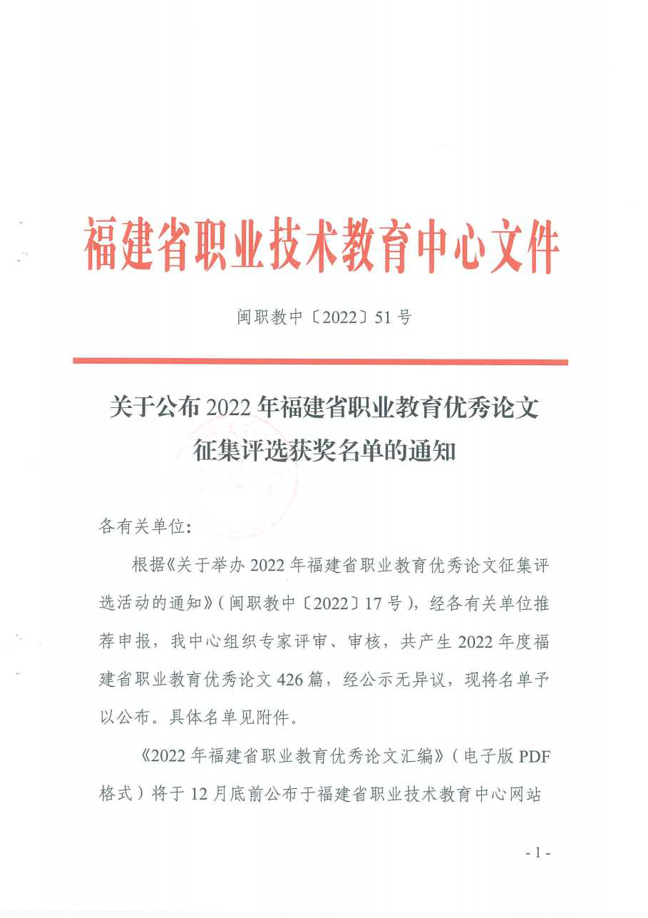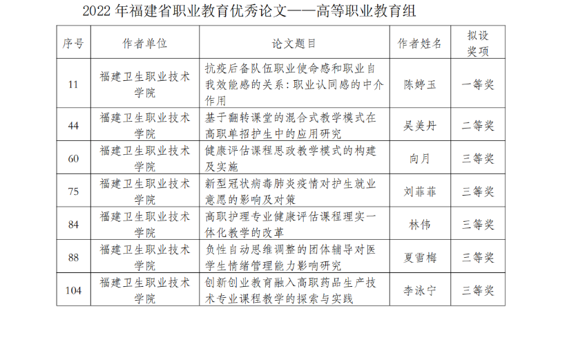 近日,在福建省職業(yè)技術(shù)教育中心組織的2022年福建省職業(yè)教育優(yōu)秀論文征集評選活動中,我校有7篇論文獲獎。陳婷玉老師的《抗疫后備隊伍職業(yè)使命感和職業(yè)自我效能感的關(guān)系:職業(yè)認(rèn)同感的中介作用》榮獲一等獎;吳美丹老師的《基于翻轉(zhuǎn)課堂的混合式教學(xué)模式在高職單招護生中的應(yīng)用研究》榮獲二等獎;劉菲菲老師的《新型冠狀病毒肺炎疫情對護生就業(yè)意愿的影響及對策》、林偉老師的《高職護理專業(yè)健康評估課程理實一體化教學(xué)的改革》、向月老師的《健康評估課程思政教學(xué)模式的構(gòu)建及實施》、夏雪梅老師的《負(fù)性自動思維調(diào)整的團體輔導(dǎo)對醫(yī)學(xué)生情緒管理能力影響研究》、李泳寧老師的《創(chuàng)新創(chuàng)業(yè)教育融入高職藥品生產(chǎn)技術(shù)專業(yè)課程教學(xué)的探索與實踐》榮獲三等獎。