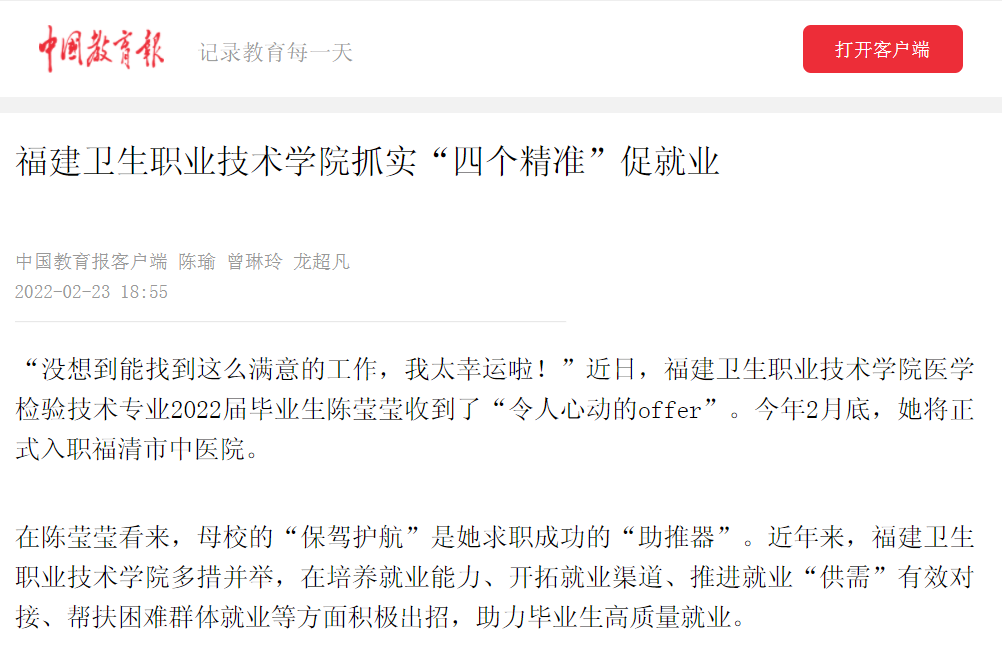 福建衛(wèi)生職業(yè)技術學院抓實“四個精準”促就業(yè)》(2022年2月23日)
