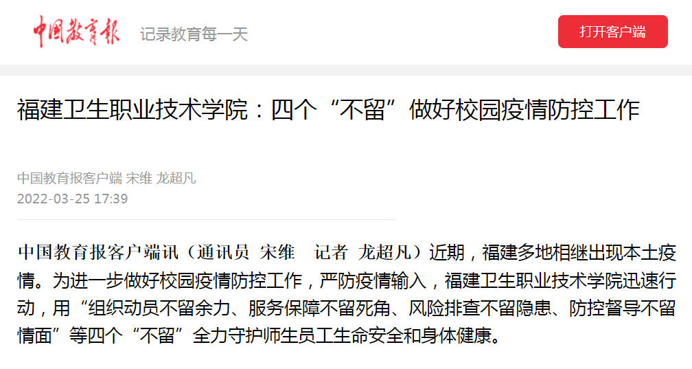 《福建衛(wèi)生職業(yè)技術學院:四個“不留”做好校園疫情防控工作》(2022年3月25日)