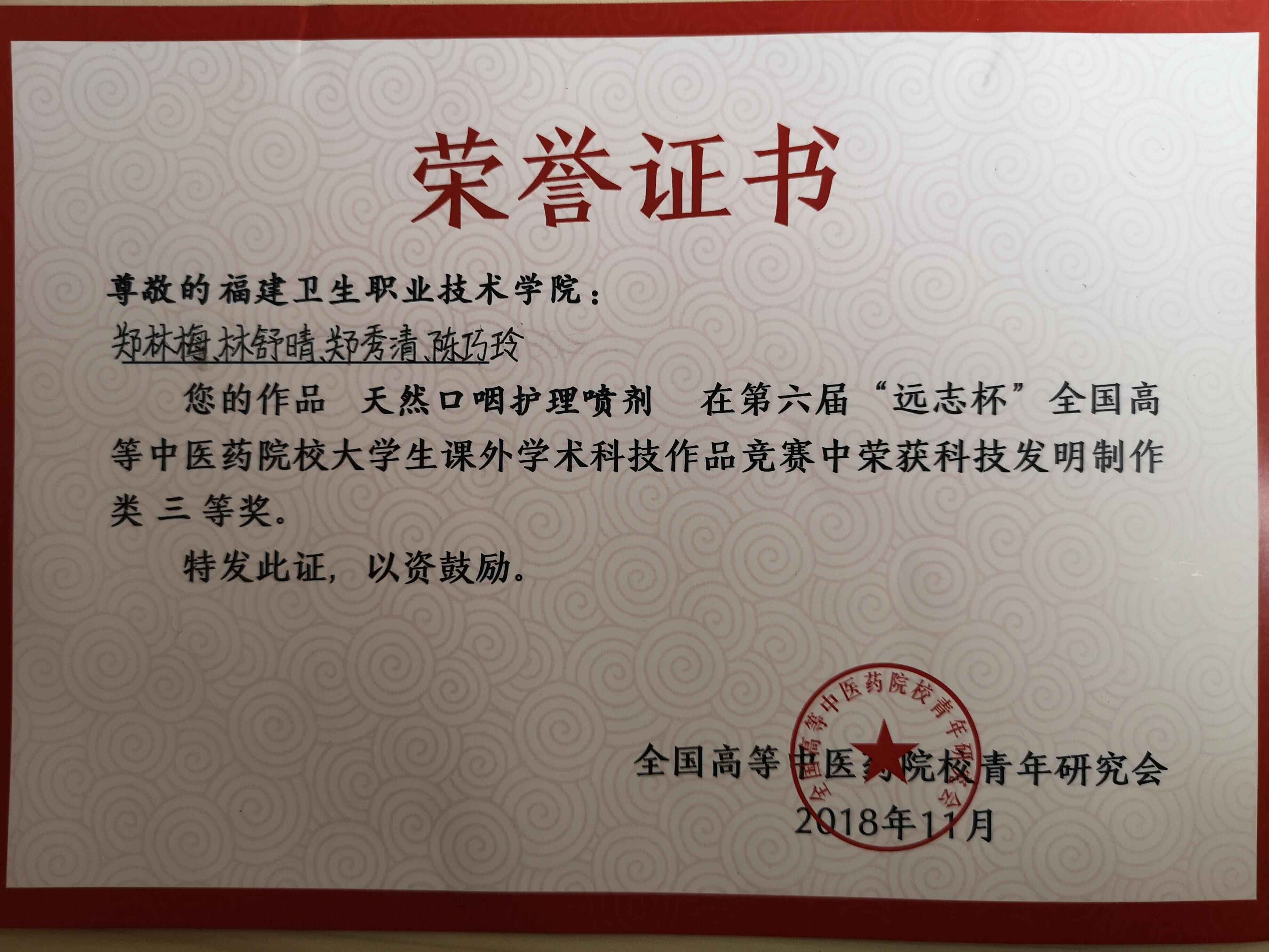 11月26日,藥學(xué)系《天然口咽護(hù)理噴劑》項(xiàng)目在第六屆“遠(yuǎn)志杯”全國(guó)高等中醫(yī)藥院校大學(xué)生課外學(xué)術(shù)科技作品競(jìng)賽中榮獲科技發(fā)明制作類三等獎(jiǎng)。該項(xiàng)目負(fù)責(zé)人為16藥學(xué)304班鄭林梅同學(xué),指導(dǎo)老師為藥學(xué)系黃仁杰教授。
