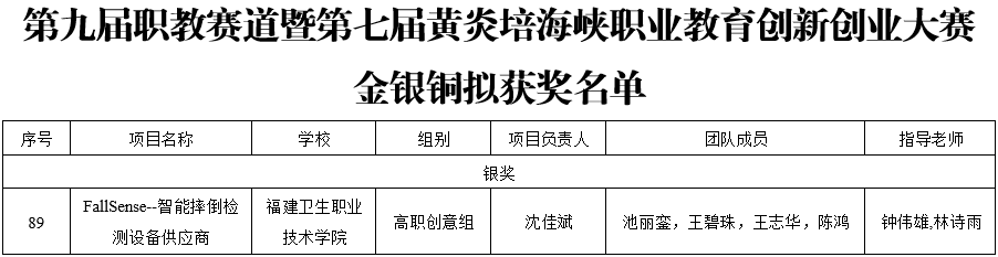 近日,第九屆福建省“互聯(lián)網(wǎng)+”大學(xué)生創(chuàng)新創(chuàng)業(yè)大賽職教賽道暨第七屆黃炎培海峽職業(yè)教育創(chuàng)新創(chuàng)業(yè)大賽在黎明職業(yè)大學(xué)舉行。我校報(bào)送的參賽項(xiàng)目《FallSense——智能摔倒檢測(cè)設(shè)備供應(yīng)商》在省賽網(wǎng)評(píng)中勝出,參加本次現(xiàn)場(chǎng)決賽并獲得銀獎(jiǎng)。