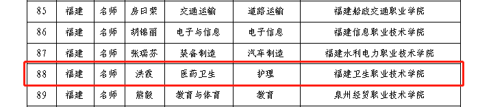本次新時(shí)代職業(yè)學(xué)校名師培養(yǎng)對象名單,福建省僅6人入選,我校也是入選的唯一一所醫(yī)藥衛(wèi)生類院校。