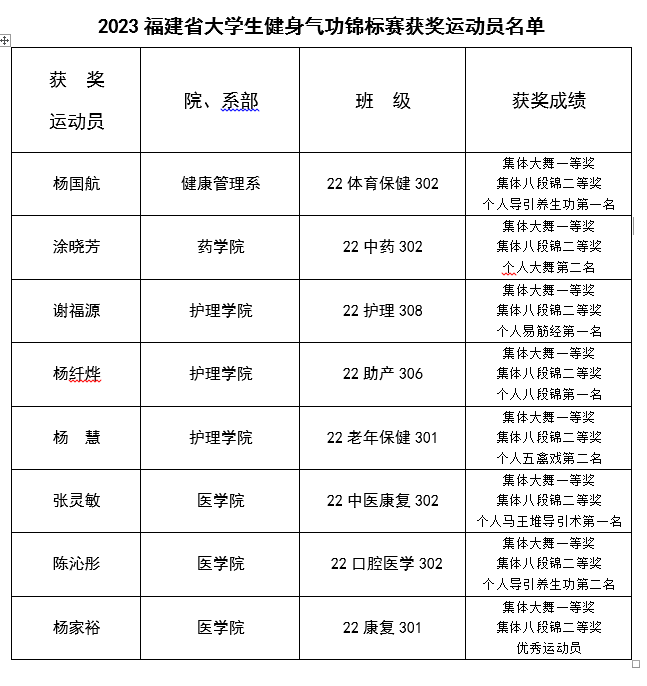 在體育部體育教研室主任李通,教練黃躍、林玉平、連期待的帶領(lǐng)下,我校健身氣功隊(duì)8名隊(duì)員以飽滿的熱情,昂揚(yáng)的斗志在比賽場(chǎng)上充分展現(xiàn)了自己的實(shí)力和風(fēng)采,最終獲得五金、四銀、團(tuán)體總分第二的好成績(jī),展示了我校學(xué)生健康向上的精神風(fēng)貌。