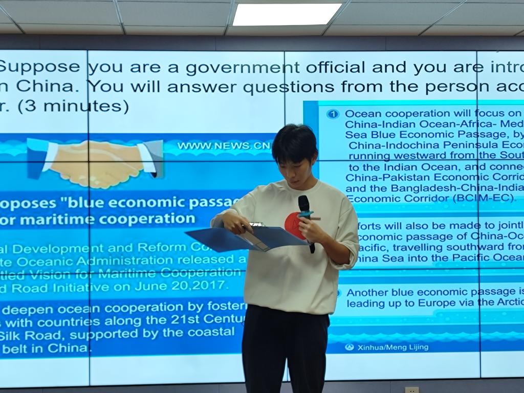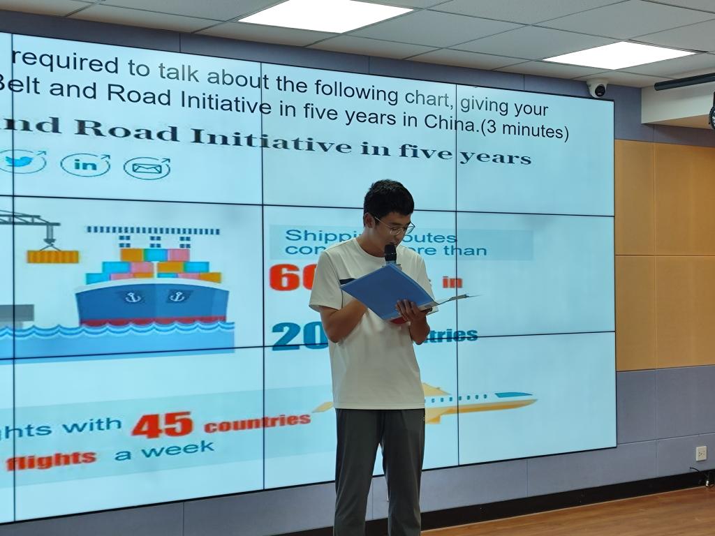 本次比賽共有200多名選手在初賽中進行激烈地角逐,選手們表現優(yōu)異、各放異彩,共有12名選手從中脫穎而出,進入決賽。為了讓入圍選手最大限度發(fā)揮自己的水平,老師們在賽前對參賽選手多次開展指導活動。決賽中,12名選手通過“現場描述”和“情景交流”兩個環(huán)節(jié)綻放光彩,用英文講述了我國“一帶一路”倡議,加深了對祖國共建共享規(guī)劃的認識,表達了我校學子對國家繁榮發(fā)展的密切關注與自豪之情。