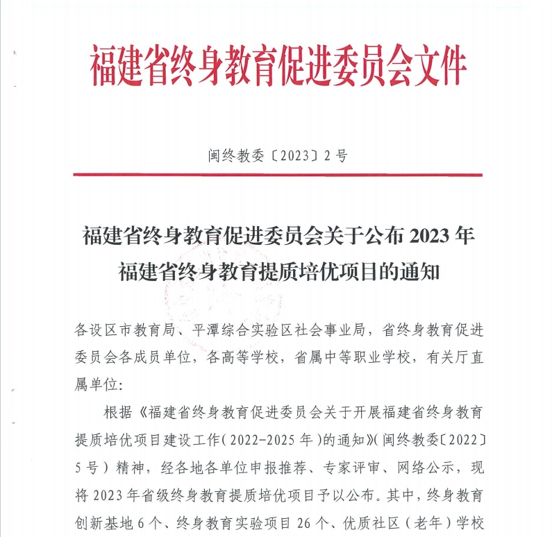 福建省終身教育提質(zhì)培優(yōu)項(xiàng)目是福建省貫徹中共中央、國(guó)務(wù)院《關(guān)于加強(qiáng)新時(shí)代老齡工作的意見(jiàn)》的重大舉措,旨在多渠道擴(kuò)大社區(qū)教育、老年教育資源供給,完善我省終身教育服務(wù)體系,打造具有福建特色的終身教育發(fā)展模式,助力“構(gòu)建服務(wù)全民終身學(xué)習(xí)的教育體系”。經(jīng)各地各單位申報(bào)推薦、專家評(píng)審、網(wǎng)絡(luò)公示,2023年福建省終身教育提質(zhì)培優(yōu)項(xiàng)目共入選終身教育創(chuàng)新基地6個(gè)、終身教育實(shí)驗(yàn)項(xiàng)目26個(gè)、優(yōu)質(zhì)社區(qū)(老年)學(xué)校(學(xué)習(xí)中心)18個(gè)、社區(qū)(老年)教育鄉(xiāng)土教材13冊(cè)、社區(qū)(老年)教育課程資源25門339講、高校老年大學(xué)4所、學(xué)習(xí)型社區(qū)(村)22個(gè)、終身教育重點(diǎn)研究課題立項(xiàng)3個(gè)、終身教育一般研究課題立項(xiàng)47個(gè)。