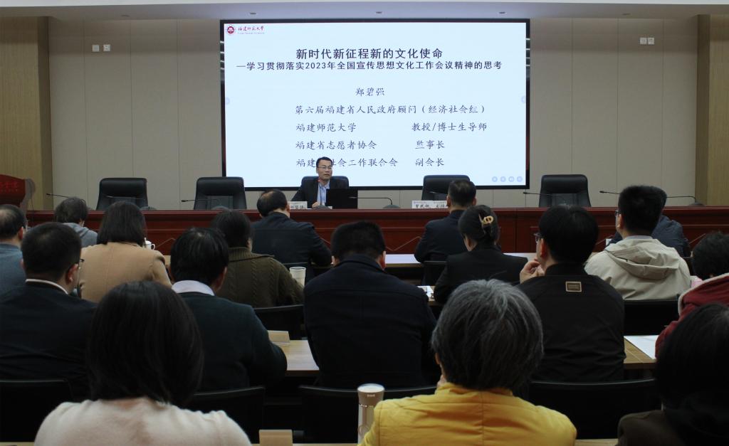 會上,福建師范大學(xué)鄭碧強教授作《新時代新征程新的文化使命》專題講座。鄭碧強教授分別從深刻領(lǐng)悟習(xí)近平文化思想的核心要義、習(xí)近平總書記在福建工作期間有關(guān)宣傳思想文化工作的重要理念與重大實踐、新形勢下做好宣傳思想文化工作的福建優(yōu)勢與基礎(chǔ)、新形勢下做好我省宣傳思想文化工作面臨的挑戰(zhàn)、新形勢下扎實做好我省宣傳思想文化工作的對策思路五個方面深入淺出、系統(tǒng)全面闡釋了新時代新征程新的文化使命。對于我校深入學(xué)習(xí)貫徹習(xí)近平新時代中國特色社會主義思想和習(xí)近平文化思想,推動學(xué)校宣傳思想文化工作落細(xì)落實具有重大指導(dǎo)意義。