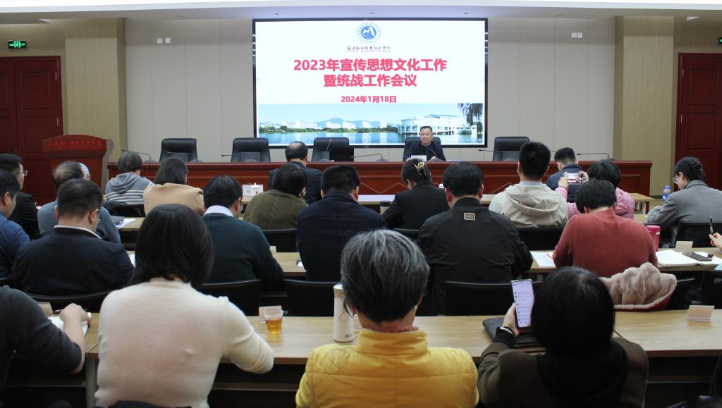 1月18日下午,我校在厚德樓六樓會議室召開2023年宣傳思想文化工作暨統(tǒng)戰(zhàn)工作會議。學(xué)校領(lǐng)導(dǎo)及全體中層干部、師生黨支部書記代表、統(tǒng)戰(zhàn)工作人員代表、各學(xué)院輔導(dǎo)員代表參加會議,會議由校黨委書記曾武祈主持。