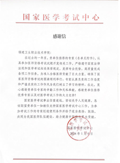 近日,我校收到國家醫(yī)學(xué)考試中心發(fā)來的感謝信,信中對我校公共衛(wèi)生與健康管理學(xué)院李宏老師作為專家組成員參加國家醫(yī)學(xué)考試中心醫(yī)師資格考試試題開發(fā)相關(guān)工作表示感謝和肯定。