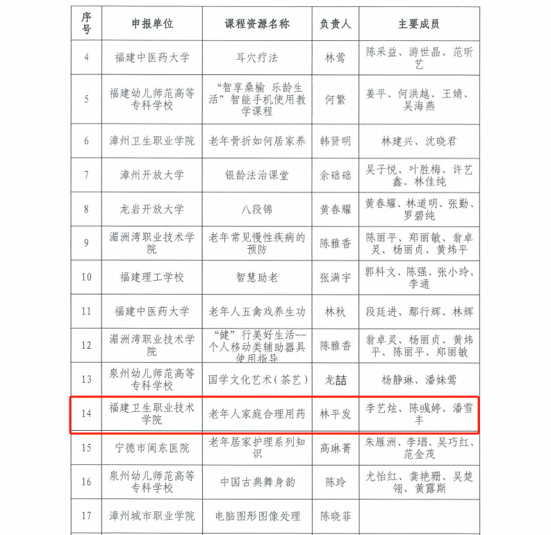 近日,福建省教育廳公布2024年省級“智慧助老”優(yōu)質(zhì)工作案例和課程資源推介名單,我校藥學(xué)院林平發(fā)老師負責(zé)的《老年人家庭合理用藥》入選優(yōu)質(zhì)課程資源。