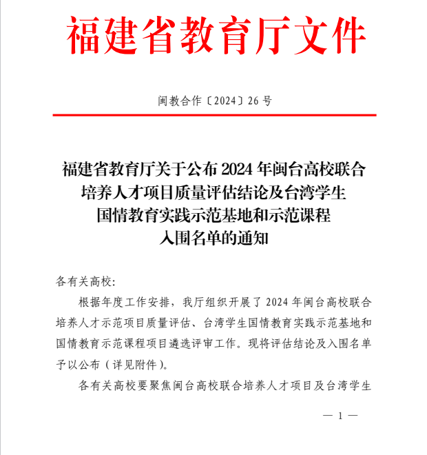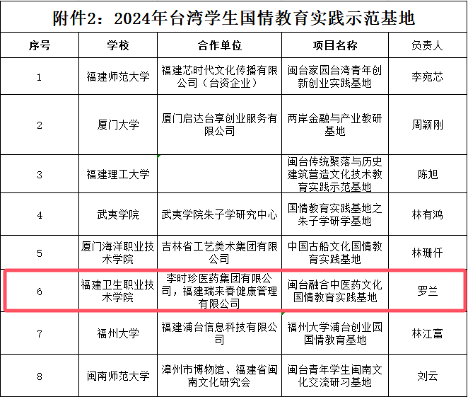近日,福建省教育廳公布2024年臺灣學(xué)生國情教育實踐示范基地入圍名單,全省共有8個示范基地入選。我校申報的閩臺融合中醫(yī)藥文化國情教育實踐基地獲批臺灣學(xué)生國情教育實踐示范基地項目。