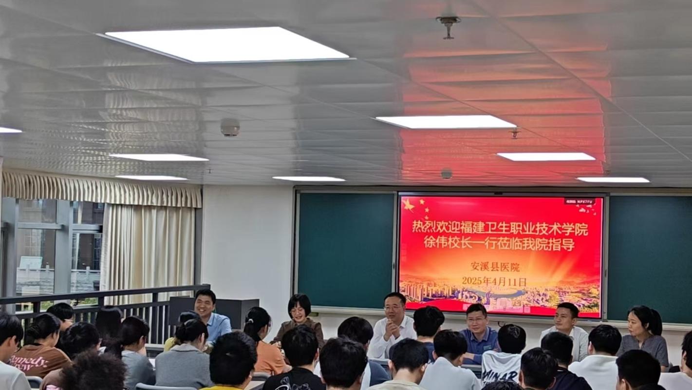 在安溪縣醫(yī)院調(diào)研期間,我校一行在副院長(zhǎng)肖建佳的陪同下,先后考察醫(yī)院臨床技能中心、中心實(shí)驗(yàn)室、圖書館以及食堂,并與科教科及帶教老師進(jìn)行深入交流,了解醫(yī)院的教學(xué)理念、教學(xué)培訓(xùn)管理以及科研體系,特別指出醫(yī)院構(gòu)建了“基礎(chǔ)技能-??萍寄?綜合能力”三級(jí)進(jìn)階培養(yǎng)體系,充分體現(xiàn)了以崗位勝任力為導(dǎo)向的醫(yī)學(xué)教育改革理念,對(duì)醫(yī)院為學(xué)生提供的優(yōu)越實(shí)踐環(huán)境和學(xué)習(xí)生活條件給予高度評(píng)價(jià)并表達(dá)感謝。隨后他與實(shí)習(xí)生及23級(jí)臨床醫(yī)學(xué)專業(yè)學(xué)生開展座談,座談會(huì)氣氛熱烈,同學(xué)們踴躍發(fā)言,分享見習(xí)實(shí)習(xí)的經(jīng)歷,從初入臨床的青澀到逐漸熟練掌握技能的成長(zhǎng),從與患者溝通的困難到團(tuán)隊(duì)協(xié)作的感悟。徐偉不時(shí)點(diǎn)頭肯定,并給予鼓勵(lì)與寶貴建議。他強(qiáng)調(diào),見習(xí)實(shí)習(xí)是難得的學(xué)習(xí)機(jī)會(huì),同學(xué)們要努力學(xué)習(xí)專業(yè)知識(shí),不斷提升實(shí)踐技能,為未來的職業(yè)生涯打下堅(jiān)實(shí)基礎(chǔ)。