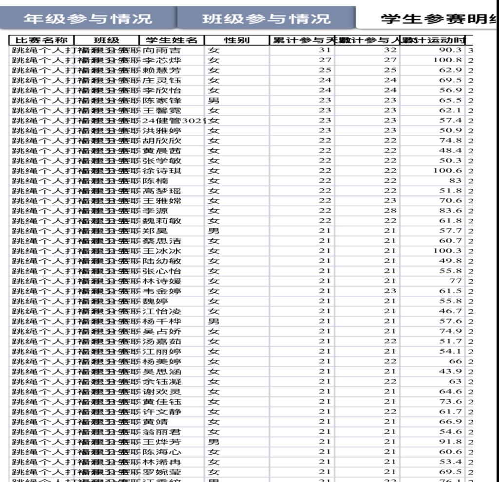 本次活動(dòng)共有205名同學(xué)完成21天跳繩打卡,活動(dòng)總負(fù)責(zé)人阮秋容表示,跳繩作為一項(xiàng)簡(jiǎn)單易行、趣味性強(qiáng)的運(yùn)動(dòng),適合全體學(xué)生參與。此次跳繩比賽不僅賽出了我校學(xué)子的蓬勃朝氣,更傳遞了“健康第一”的教育理念,為校園增添了一抹動(dòng)感活力。
