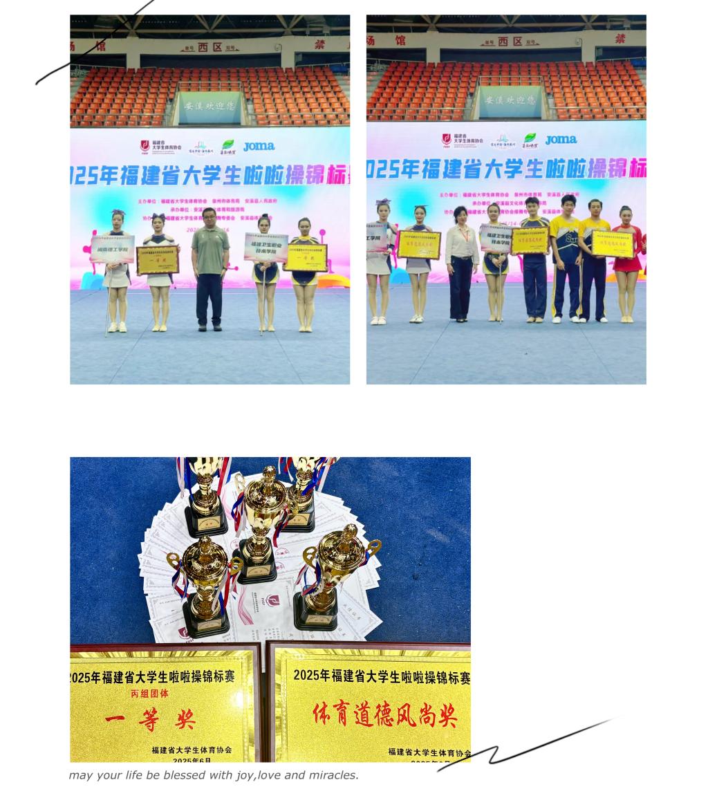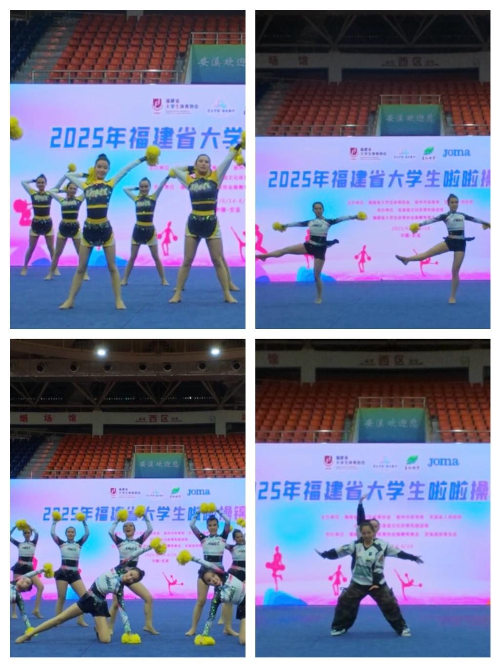 6月14-16日,福建省大學(xué)生啦啦操錦標(biāo)賽在安溪縣梧桐體育館開賽,來自全省21所高校的精英隊伍齊聚一堂,展開角逐。我校操舞運動隊18名運動員在領(lǐng)隊阮秋容以及教練鄧素華、劉麗萍、胡麗芳、余照鋮的帶領(lǐng)下,在多個賽項中脫穎而出,最終取得單項3金2銅和團(tuán)體一等獎并榮獲體育道德風(fēng)尚獎,實現(xiàn)比賽成績與精神文明雙豐收。