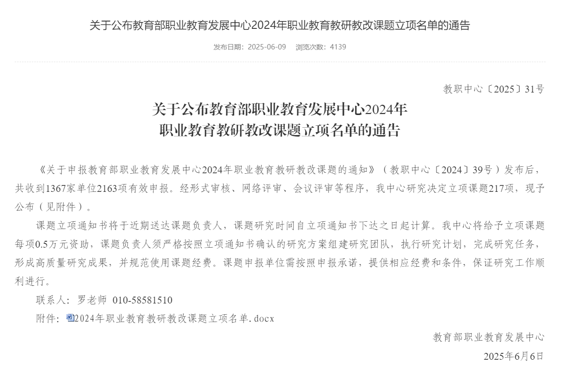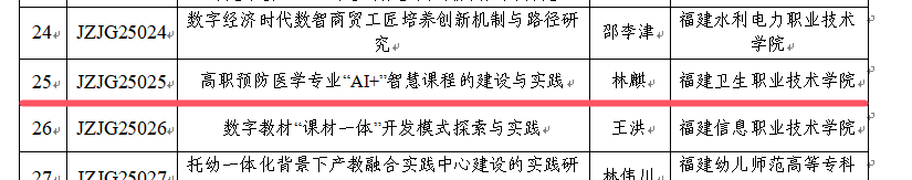 近日,教育部職業(yè)教育發(fā)展中心正式公布2024年職業(yè)教育教研教改課題立項(xiàng)名單。我校預(yù)防醫(yī)學(xué)專業(yè)帶頭人林麒老師申報(bào)的《高職預(yù)防醫(yī)學(xué)專業(yè)“AI +”智慧課程的建設(shè)與實(shí)踐》課題成功獲批立項(xiàng),為學(xué)校教育教學(xué)改革再添新成果。