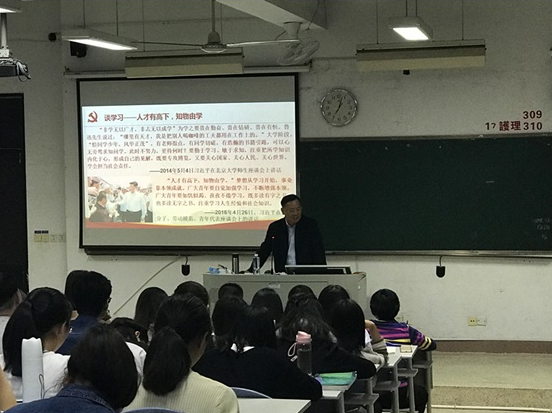 4月10日,我院黨委曾武祈書記走進(jìn)思政課堂,為護(hù)理系學(xué)生講授以“征程新時代 召喚新青年 勇?lián)率姑睘橹黝}的形勢政策課。