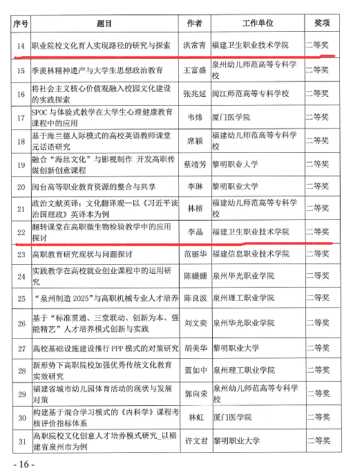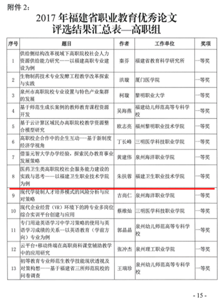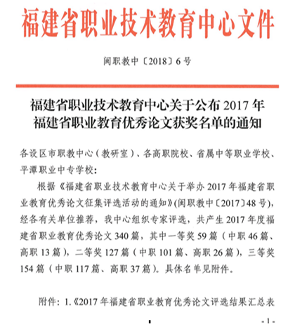 根據(jù)《福建省職業(yè)技術(shù)教育中心關(guān)于公布2017年福建省職業(yè)教育優(yōu)秀論文獲獎(jiǎng)名單的通知》(閩職教中〔2018〕6號(hào))文件通知,我院朱扶蓉老師的論文《醫(yī)藥衛(wèi)生類(lèi)高職院校社會(huì)服務(wù)能力建設(shè)的實(shí)踐與思考》喜獲2017年福建省職業(yè)教育優(yōu)秀論文評(píng)選高職組一等獎(jiǎng),洪常青老師的論文《職業(yè)院校文化育人實(shí)現(xiàn)路徑的研究與探索》及李晶老師的《翻轉(zhuǎn)課堂在高職微生物檢驗(yàn)教學(xué)中的應(yīng)用探討》喜獲2017年福建省職業(yè)教育優(yōu)秀論文評(píng)選高職組二等獎(jiǎng)。