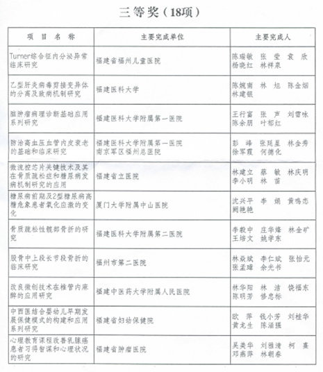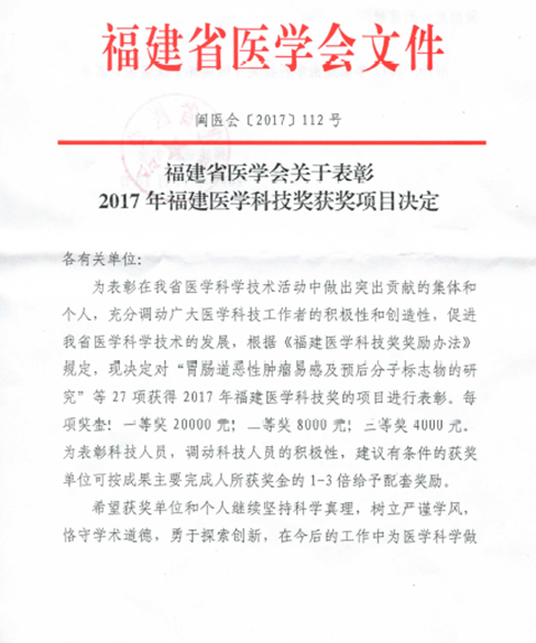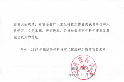 根據(jù)《福建省醫(yī)學(xué)會(huì)關(guān)于表彰福建醫(yī)學(xué)科技獎(jiǎng)獲獎(jiǎng)項(xiàng)目的決定》(閩醫(yī)會(huì)〔2017〕112號(hào))文件通知,我院黃仁杰、肖健等老師為主要完成人的“伏立諾他原料及其膠囊劑的開發(fā)”項(xiàng)目喜獲2017年福建省醫(yī)學(xué)科技獎(jiǎng)三等獎(jiǎng)。