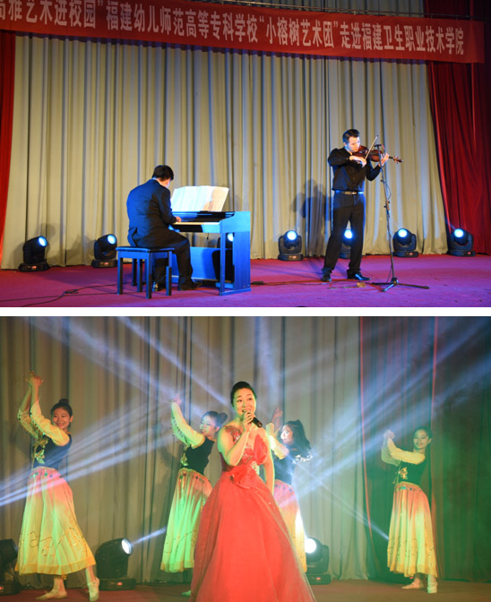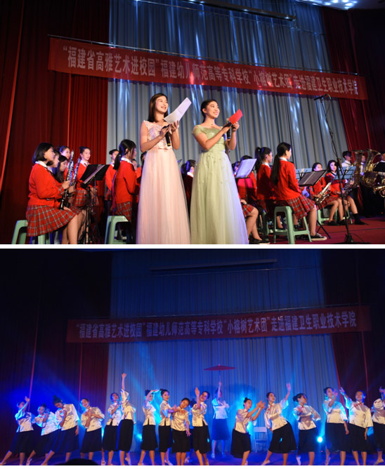 福建幼兒師范高等??茖W(xué)?!靶¢艠渌囆g(shù)團(tuán)”為我院師生帶來(lái)了一場(chǎng)藝術(shù)盛宴:管樂(lè)合奏《Mission Impossible》《Accidentally in love》拉開帷幕;舞蹈《坊巷芳華》更是韻味十足;肖豆豆老師的女聲獨(dú)唱《一杯美酒》作為壓軸,將演出推向高潮。新穎多樣的節(jié)目表演出色地表現(xiàn)了高雅藝術(shù)的獨(dú)特魅力,也把幼兒高等??茖W(xué)校學(xué)子的藝術(shù)細(xì)胞展現(xiàn)得淋漓盡致。