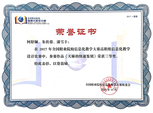 我院藥學(xué)系何舒瀾、朱扶蓉、潘雪豐等三位教師的參賽作品《天麻的快速鑒別》經(jīng)過(guò)院賽、省賽、省選拔賽、國(guó)賽網(wǎng)絡(luò)評(píng)審等層層選拔,最終進(jìn)入決賽,并憑借先進(jìn)的教學(xué)理念、精巧的教學(xué)設(shè)計(jì)、精湛的授課能力榮獲高職組信息化教學(xué)設(shè)計(jì)大賽三等獎(jiǎng)。