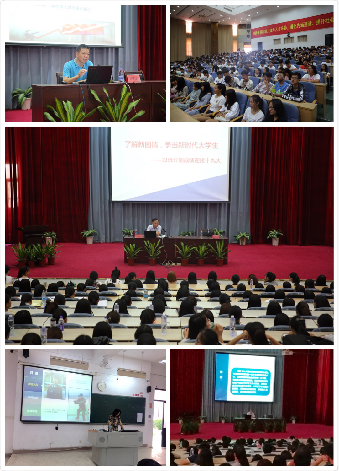 2017年9月17日,學院黨委書記曾武祈、黨委副書記林建團、副院長黃開良、紀委書記李美華圍繞“了解新國情,爭當新時代大學生——以優(yōu)異的成績迎接十九大”的主題,為2017級新生講授了《形勢與政策》第一課,2670名新生聆聽了講課。