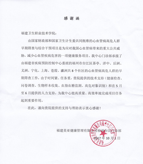 近日,福建美亞健康管理有限公司福州臺(tái)江門診部向我院管理系發(fā)來(lái)感謝函,對(duì)我院管理系在《心血管病高危人群早期篩查與綜合干預(yù)項(xiàng)目》臺(tái)江調(diào)查點(diǎn)提供的專業(yè)技術(shù)服務(wù)表示衷心感謝。