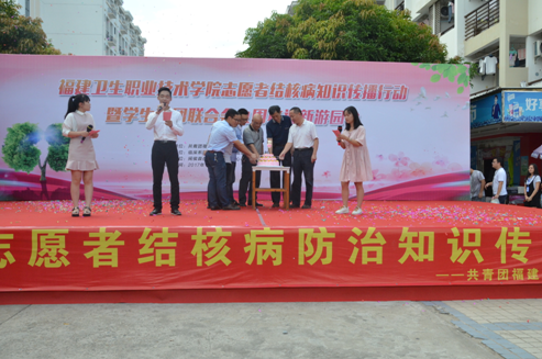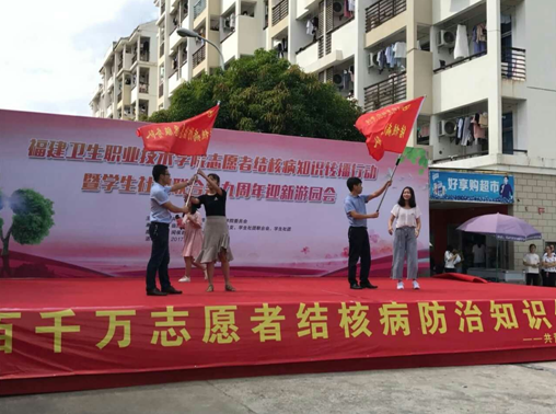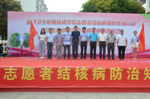 在院黨委林建團(tuán)副書記致辭后,閩侯縣疾控中心江仁銜主任現(xiàn)場介紹了結(jié)核病在我國的傳播情況,并為志愿者加油鼓勁。隨后,江仁銜主任和院團(tuán)委黃曦副書記一同為兩支結(jié)核病防治志愿者服務(wù)隊授旗。管理系王國浩老師在現(xiàn)場進(jìn)行了結(jié)核病防治知識宣教。