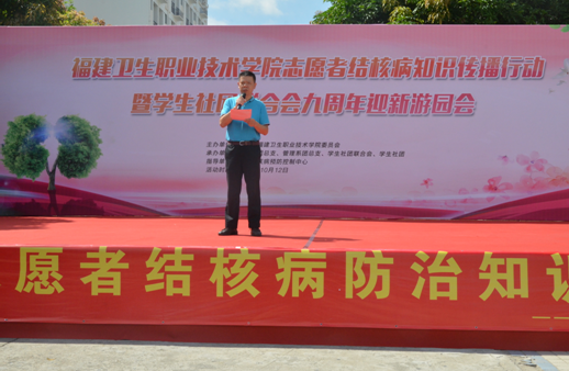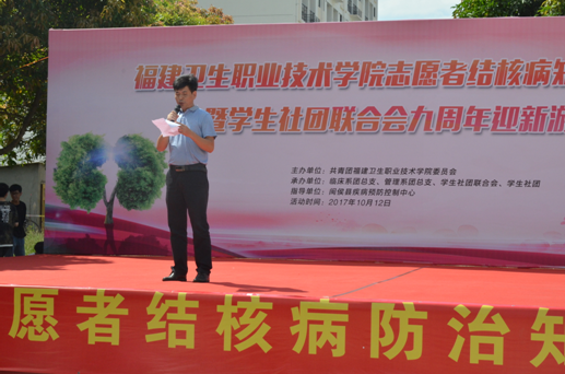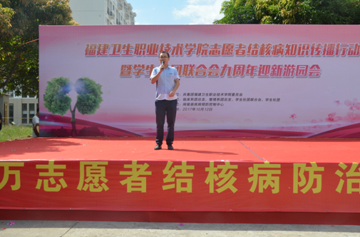 2017年10月12日,由共青團(tuán)福建衛(wèi)生職業(yè)技術(shù)學(xué)院委員會主辦,臨床醫(yī)學(xué)系團(tuán)總支、管理系團(tuán)總支、學(xué)生社團(tuán)聯(lián)合會承辦的“志愿者防治結(jié)核病知識傳播行動”在福建衛(wèi)生職業(yè)技術(shù)學(xué)院校園舉行。此次活動是國家衛(wèi)生計生委百千萬志愿者結(jié)核病防治知識傳播系列活動之一,傳播行動得到了閩侯縣CDC的大力支持。閩侯縣疾控中心江仁銜主任、院黨委林建團(tuán)副書記出席活動現(xiàn)場,各系黨總支負(fù)責(zé)人、院團(tuán)委黃曦副書記和各系團(tuán)總支書記等參加活動。