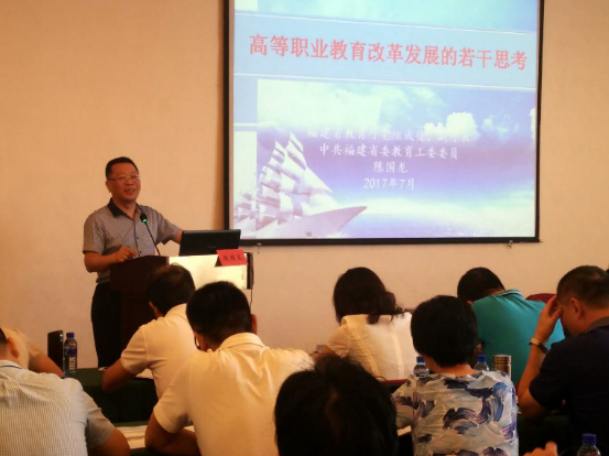 7月5日上午,學院黨委書記曾武祈主持開班儀式。福建省教育廳黨組成員、副廳長陳國龍同志應邀來我院作題為《高等職業(yè)教育改革發(fā)展的若干思考》的專題講座,從我省職業(yè)教育的發(fā)展歷程、改革任務兩個方面展開,強調(diào)高職院校要堅持需求導向、問題導向、效果導向,努力辦專辦特辦優(yōu),我省將繼續(xù)堅持“補短板、抓內(nèi)涵、創(chuàng)特色、樹品牌”,努力把職業(yè)教育提升到新的水平。