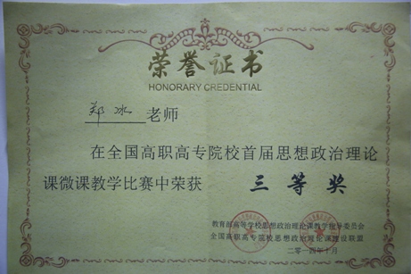 教育部高等學(xué)校思想政治理論課教學(xué)指導(dǎo)委員會(huì)、全國(guó)高職高專院校思想政治理論課建設(shè)聯(lián)盟于2014年6月20日-10月10日聯(lián)合主辦了首屆全國(guó)高職高專思想政治理論課微課教學(xué)比賽,經(jīng)激烈角逐,我院選送的鄭冰老師《形勢(shì)與政策》微課榮獲三等獎(jiǎng)。(思政教研部)