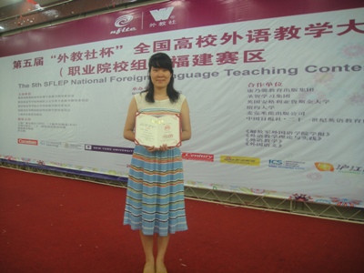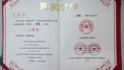 由教育部高等學(xué)校外國語言文學(xué)類專業(yè)教學(xué)指導(dǎo)委員會、教育部高等學(xué)校大學(xué)外語教學(xué)指導(dǎo)委員會、教育部職業(yè)院校外語類專業(yè)教學(xué)指導(dǎo)委員會和上海外語教育出版社主辦的“外教社杯”全國高校外語教學(xué)大賽(職業(yè)院校組)福建賽區(qū)復(fù)賽、決賽于2014年6月7日-8日在福建信息職業(yè)技術(shù)學(xué)院舉行。經(jīng)過初賽選拔,全省18所高職院校的英語教師參加復(fù)賽、決賽,我院英語教研室李源園老師經(jīng)過復(fù)賽授課(20分鐘)、決賽說課(10分鐘)兩個(gè)環(huán)節(jié)的激烈角逐,最終獲得二等獎(jiǎng)。(公共基礎(chǔ)部)