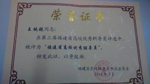 2014年4月2日~3日第三屆福建省高校輔導(dǎo)員職業(yè)能力大賽在福建師范大學(xué)旗山校區(qū)舉行。我院醫(yī)學(xué)技術(shù)系輔導(dǎo)員楊盈老師參賽,經(jīng)過緊張激烈的復(fù)賽、決賽,喜獲三等獎。本次輔導(dǎo)員職業(yè)技能大賽,展示了學(xué)院輔導(dǎo)員隊伍職業(yè)化、專業(yè)化的建設(shè)成果,交流了學(xué)院學(xué)生管理工作的做法和經(jīng)驗,是對學(xué)院學(xué)生教育和管理工作的一次檢驗。