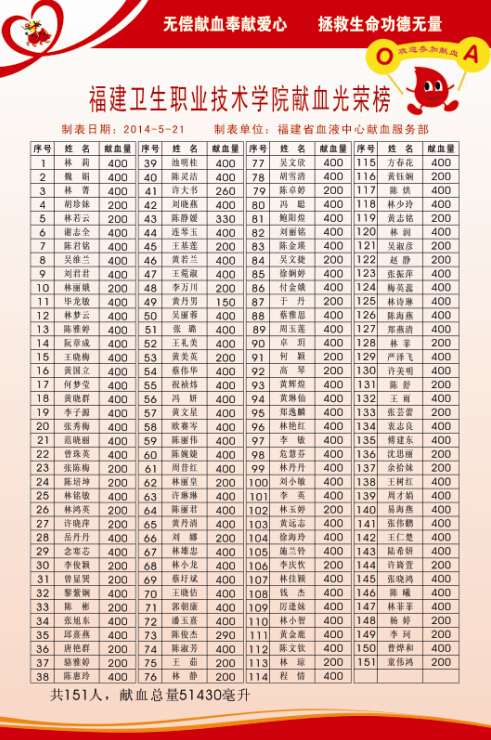 5月20日,我院與省血液中心聯(lián)合開展了無償獻(xiàn)血活動,這是學(xué)院生命健康教育月的又一主題活動。院紅十字會、學(xué)生會和血緣社社團(tuán)積極宣傳并組織了本次活動。本次無償獻(xiàn)血活動從上午11點至下午4點,共計151人獻(xiàn)血51430毫升。