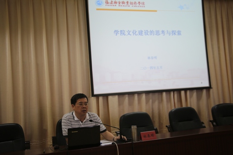 6月3日下午,學(xué)院黨委書記林春明應(yīng)邀在行政樓六樓為全院師生作題為《學(xué)院文化建設(shè)的思考與探索》的講座。全院副高級(jí)以上職稱人員、副科級(jí)以上干部、教研室主任、輔導(dǎo)員及部分學(xué)生代表200多人聆聽了講座,講座由副院長(zhǎng)廖偉堅(jiān)主持。