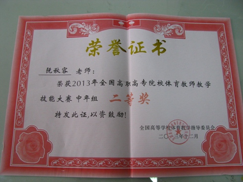 2013年 12月18日-22日在浙江經(jīng)濟(jì)職業(yè)技術(shù)學(xué)院舉行的“2013年全國(guó)高職高專院校體育教師技能大賽”中,我院公共基礎(chǔ)部阮秋容老師參加了中年組的角逐,取得了中年組二等獎(jiǎng)的好成績(jī)。