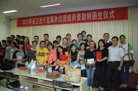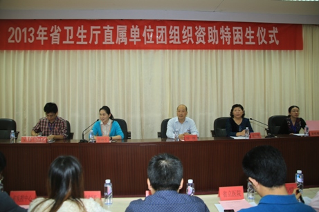 11月7日下午,2013年省衛(wèi)生廳直屬單位團組織資助特困生儀式在我院隆重舉行。衛(wèi)生廳直屬單位各團組織的代表和受資助學生參加了儀式。院黨委陳雄副書記、魏立娜副院長、省衛(wèi)生廳團委陳曉芩書記、院學工處黃銘珊處長、院團委宋維副書記出席本次活動。