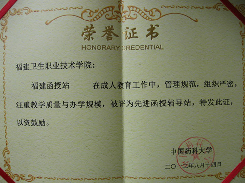 2012年中國(guó)藥科大學(xué)成人教育學(xué)院函授站工作年會(huì)上傳來(lái)喜訊:中國(guó)藥科大學(xué)福建函授站(設(shè)在我院)被中國(guó)藥科大學(xué)評(píng)為先進(jìn)函授輔導(dǎo)站,并受到表彰。