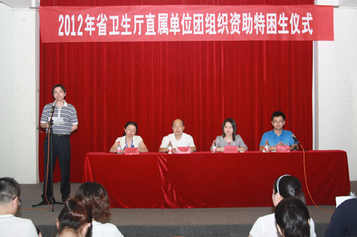 6月14日下午,2012年省衛(wèi)生廳直屬單位團(tuán)組織資助特困生儀式在我院明湖師生活動中心隆重舉行。衛(wèi)生廳直屬單位各團(tuán)組織的代表和受資助學(xué)生參加了儀式。院黨委陳雄副書記、省衛(wèi)生廳團(tuán)委陳曉芩書記、院學(xué)工處黃銘珊處長、院團(tuán)委宋維副書記出席。