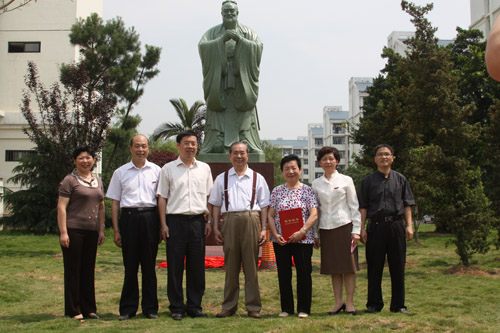 5月26日上午,我校隆重舉行孔子塑像落成儀式??鬃铀芟袷怯始裔t(yī)學(xué)會會員、首批國務(wù)院特殊津貼專家、福建中醫(yī)藥大學(xué)教授、福州市第一醫(yī)院主任醫(yī)師、醫(yī)學(xué)博士潘明繼先生與其夫人施增英女士捐贈我校、由臺灣著名雕塑家陳一凡先生雕塑完成。潘明繼教授及夫人、嚴(yán)肅書記、林春明院長等領(lǐng)導(dǎo)和教職工代表、學(xué)生代表參加了儀式,儀式由院黨委副書記陳雄主持。