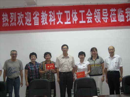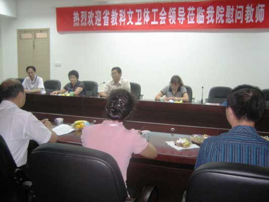為慶祝第25個(gè)教師節(jié),省教科文衛(wèi)體工會(huì)領(lǐng)導(dǎo)副主任張?jiān)?、張洪璇、趙毅、副處調(diào)研員趙瑞英及省直醫(yī)務(wù)工會(huì)領(lǐng)導(dǎo)一行五人于2009年9月8日下午到我院慰問(wèn)教師。我院陳雄副書(shū)記及獲省優(yōu)秀教師稱號(hào)的林志明、謝濤等十位老師參加了座談會(huì)。