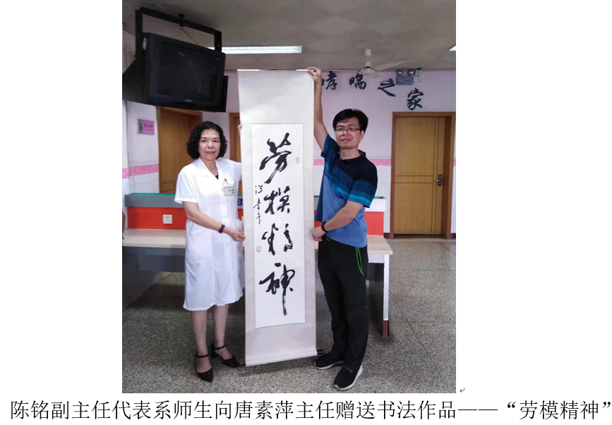 學生們在與醫(yī)生的零距離接觸中,深入了解了平日的醫(yī)療和醫(yī)院工作,體驗了醫(yī)生的辛勞與職業(yè)的崇高感。在“醫(yī)學課堂”里,新生兒護士的一線言傳身教、在影像科里探秘“黑白照片”的神奇、在泌尿外科聆聽醫(yī)生的現(xiàn)場教學……這些難得深入一見的醫(yī)學場景,讓孩子們大開眼界,加深了對醫(yī)學的認知。值此醫(yī)師節(jié)之際,我院臨床系陳潔副書記和陳銘副主任代表系全體師生向唐素萍主任獻上院工會副主席書法作品“勞模精神”,以表敬意和感謝。