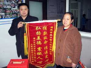 1月18日下午王配劍母親在檢驗影像系馬清璇老師、傅衍達老師的陪同下前往美可普義齒制作有限公司,公司負(fù)責(zé)人將捐款交于王配劍母親手中。王配劍母親將感激之情述于錦旗之上,表示十分感謝社會愛心人士,有這么多的愛心支撐,王配劍有信心戰(zhàn)勝病魔,創(chuàng)造生命的奇跡!王配劍的母親親手將銹有“捐款救命傳達愛心 弘揚美德震撼人心”的錦旗交到美可普義齒制作有限公司領(lǐng)導(dǎo)的手中。(檢驗影像系)