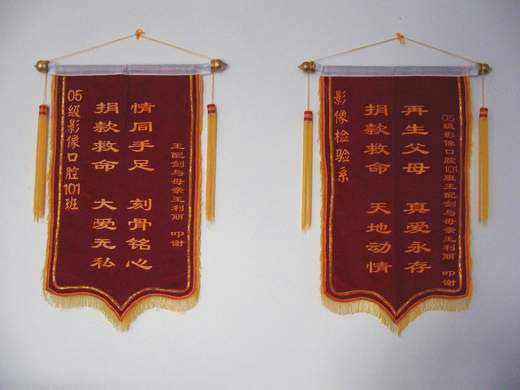 廣大社會愛心人士紛紛伸出援手,共籌集善款一萬余元,同學(xué)們將這些愛心基金送到了王配劍母親手中。為表示感激之情,王配劍母親贈送學(xué)院3面錦旗,并親手書寫感謝信。