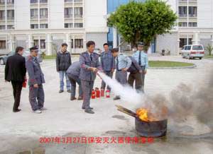 3.2007年3月27日保衛(wèi)處組織全體保安員和安防人員舉行油盆滅火演練和消防水帶操作演練。