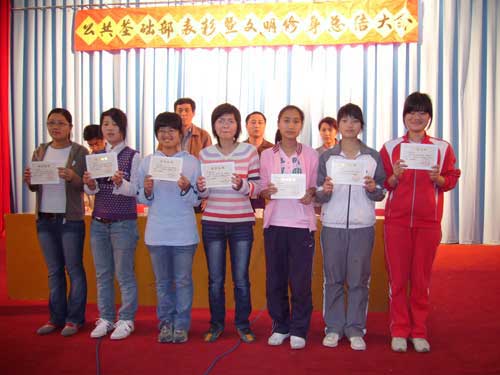 大會在雄壯的國歌聲中拉開了序幕,陳潔老師首先宣讀2006-2007學(xué)年第一學(xué)期衛(wèi)生模范宿舍、先進(jìn)個(gè)人表彰決定,上學(xué)期我部共評出6個(gè)衛(wèi)生模范宿舍和129名先進(jìn)個(gè)人。隨后進(jìn)行頒獎儀式,受表彰的衛(wèi)生模范宿舍和先進(jìn)個(gè)人代表上臺領(lǐng)獎,06級涉外護(hù)理501班謝慧林同學(xué)與5404宿舍舍長陳潔玉同學(xué)作為先進(jìn)個(gè)人與衛(wèi)生模范宿舍代表分別發(fā)言。洪聿榮書記在接下來的講話中希望我系廣大同學(xué)要珍惜榮譽(yù)、志存高遠(yuǎn)、勤奮好學(xué),不斷提高自身的綜合素質(zhì),同時(shí),他對前階段開展的“文明修身”系列活動進(jìn)行了系統(tǒng)總結(jié),號召廣大同學(xué)持之以恒,養(yǎng)成良好行為習(xí)慣,用文明譜寫青春之歌,讓青春與文明同行。最后,學(xué)工處鄭力宏處長在講話中向受到表彰的衛(wèi)生模范宿舍與先進(jìn)個(gè)人表示祝賀,對我系開展的“文明修身”系列活動給予了充分的肯定,并勉勵廣大同學(xué)不斷努力,爭取更大進(jìn)步!
