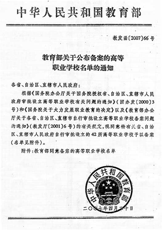 教育部于2007年4月20日下發(fā)《關于公布備案的高等職業(yè)學校名單的通知》(教發(fā)函〔2007〕66號),同意將我校予以備案,學校名稱:福建衛(wèi)生職業(yè)技術學院,學校代碼:12633。 辦公室