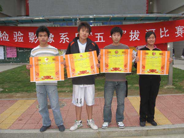 為了進(jìn)一步推動(dòng)全民健身運(yùn)動(dòng),豐富檢驗(yàn)影像系學(xué)生的業(yè)余文化、體育生活,促進(jìn)學(xué)生的身體素質(zhì),增進(jìn)全系各班級(jí)之間的團(tuán)結(jié)、友誼,增強(qiáng)班集體凝聚力和戰(zhàn)斗力,檢驗(yàn)影像系學(xué)生會(huì)體育部以“友誼第一,比賽第二”為主題舉辦了慶“五·一”拔河比賽。預(yù)賽于2007年4月27日下午在第一食堂門(mén)口舉行,28下午進(jìn)行了決賽。經(jīng)過(guò)緊張激烈的比賽和“拉拉隊(duì)”的吶喊助威,最終決出了前四名,他們分別是:05檢驗(yàn)101班、04檢驗(yàn)501班、06影像101班、05檢驗(yàn)501班。